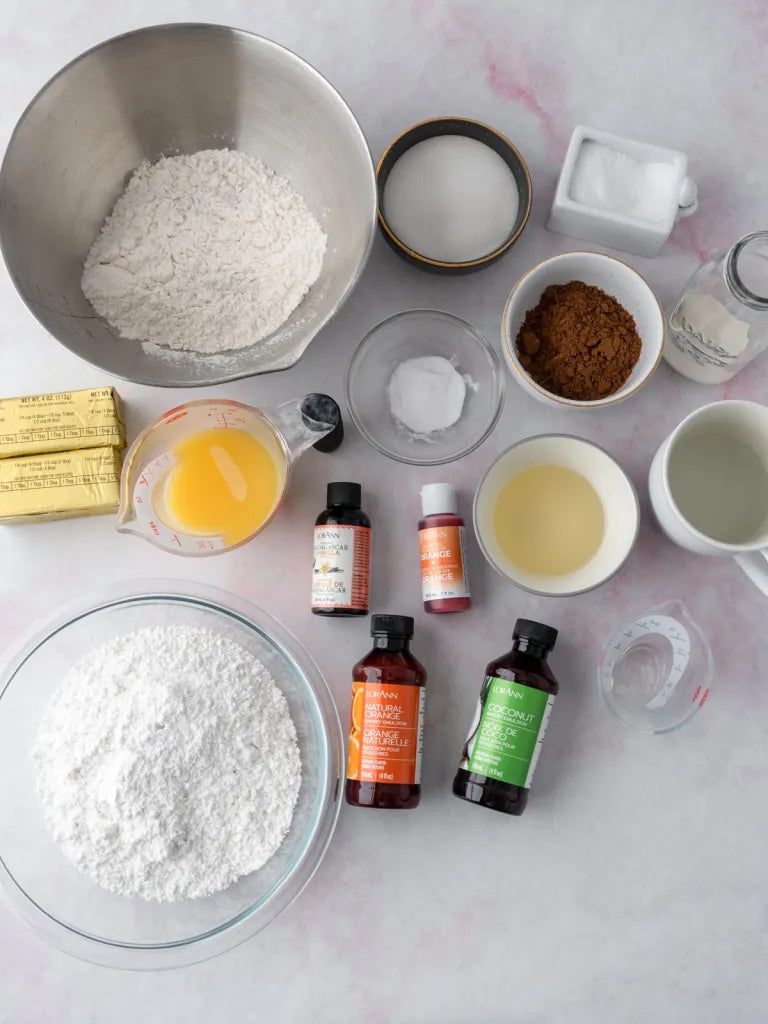 From there, you’ll transfer the dry mix into the pan and create three wells for the wet ingredients. The oil goes in one well, the vinegar goes in the second, and LorAnn Madagascar Vanilla Extract and Orange Bakery Emulsion go in the third well. The vinegar reacts with the baking soda, which helps achieve the lift we’re looking for in the finished cake.