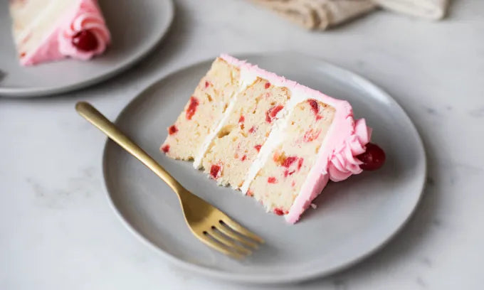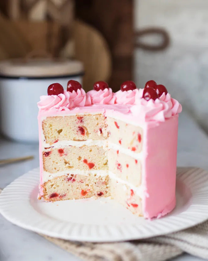 For those who are not familiar with using emulsions instead of extracts, emulsions are water based instead of alcohol based which makes it much stronger then an extract once baked. Lastly, my advice for obtaining a yellow cake with a maraschino cherry filling is to give the cherries a quick rinse before you chop them up! It removes any excess syrup that could cause a pink hue to the whole cake. I think the contrast the frosting brings to the white cake is not only prettier, but more traditional to the original cherry chip cake we all love.