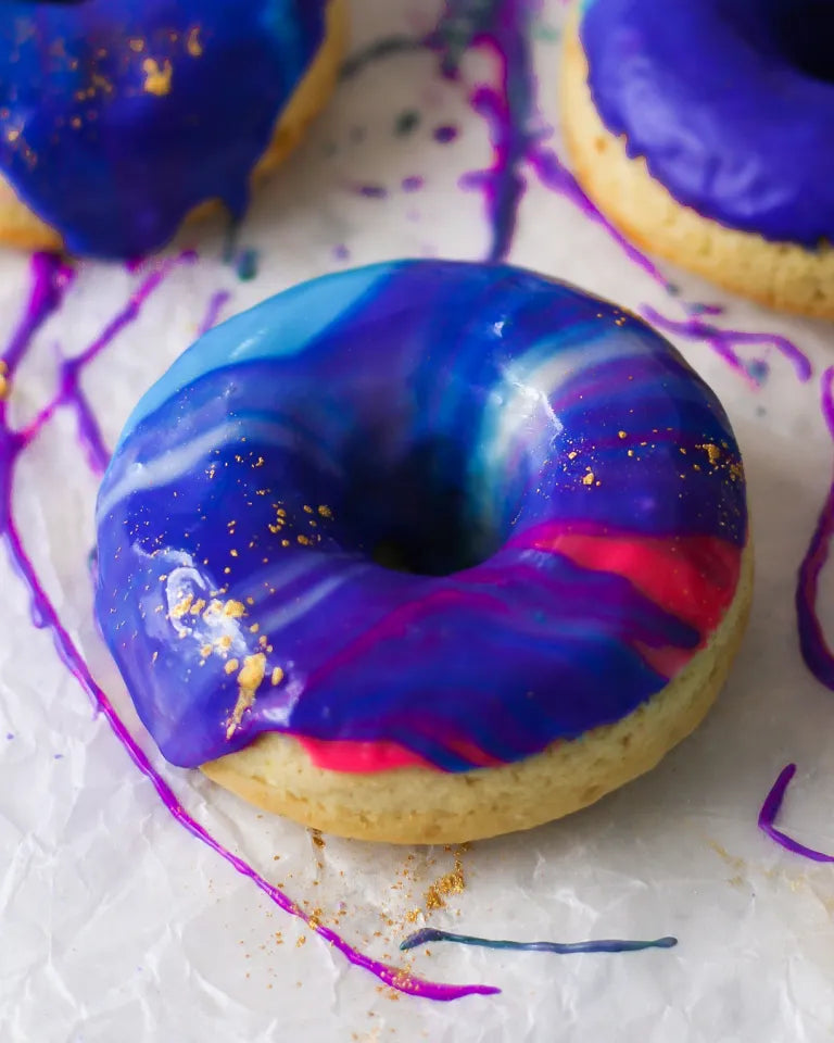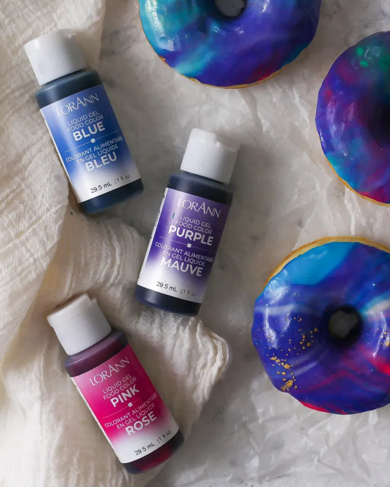 Light, fluffy and bursting with cotton candy sweetness, these donuts are so cosmic! The galaxy glaze is the real star of this recipe. Use LorAnn Liquid Gel Food Colors to create deep and vibrant galaxy shades. They are baked instead of fried and come together for an easy and delicious sweet treat!