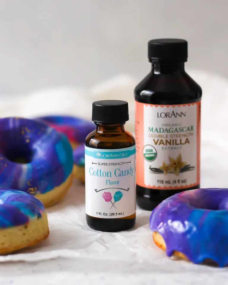 I am so excited to bring you this recipe and combine two of my favorite treats into one, donuts and cotton candy! These donuts come together so quickly and since they are baked, there is no fryer needed. They are super light and fluffy just like freshly spun cotton candy! I love that all of LorAnn Oils’ Super-Strength Flavors are 3-4 times stronger than typical extracts, so I know for certain I will never have to compromise on flavor.