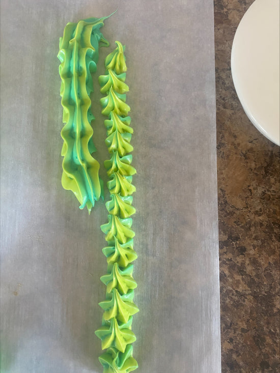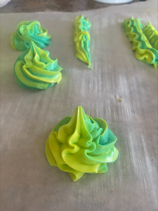 Recipe Tip: Test pipe on parchment paper to make sure both colors are coming through the piping bag to create the two-toned effect.