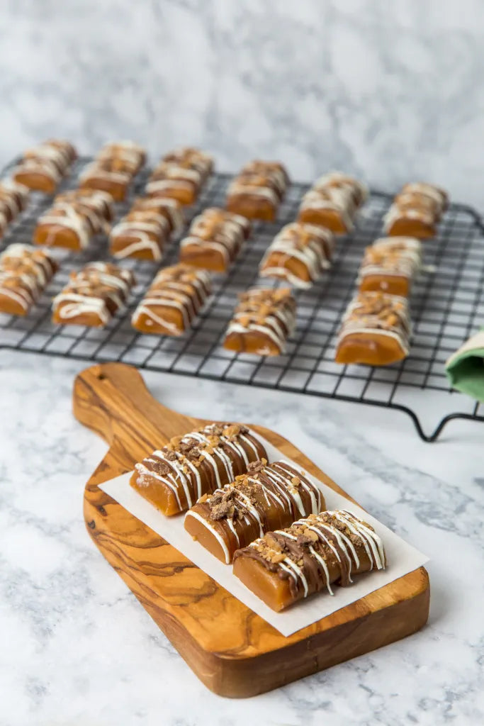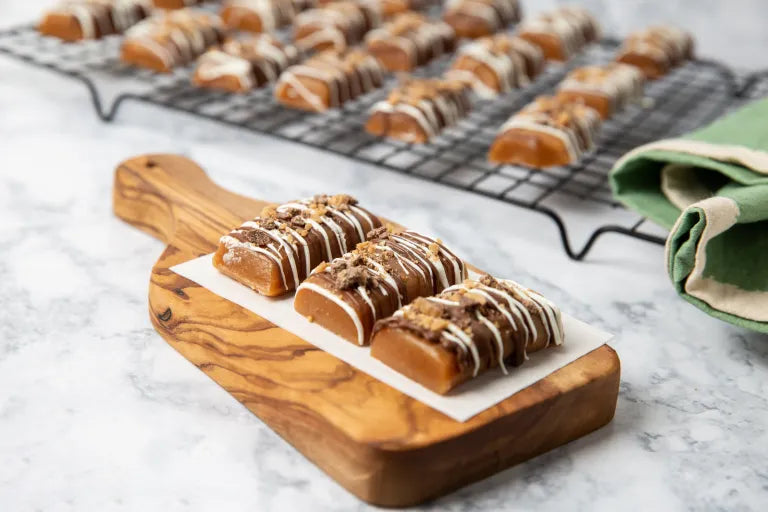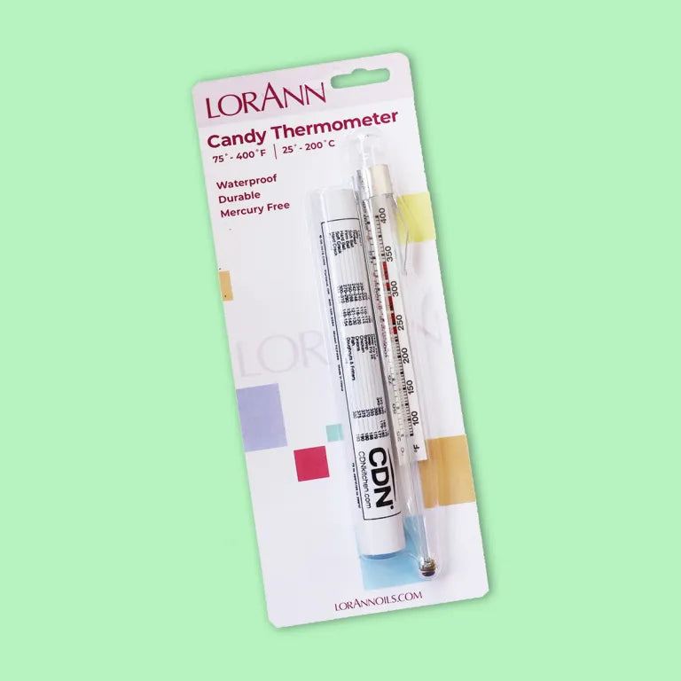 A candy thermometer, tested for accuracy, is required for this recipe. LorAnn’s twisting wax paper makes wrapping your caramels a breeze!