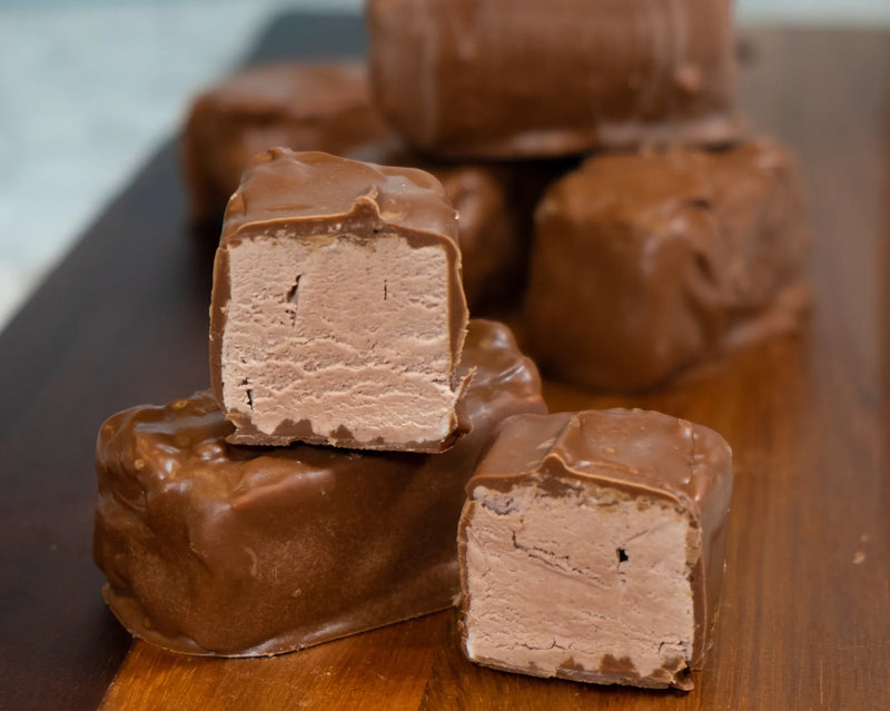 - Working one at a time using a dipping fork, place each piece of nougat into chocolate, making sure all side are coated. Carefully tap the fork to remove the excess and place coated candy on prepared tray. Repeat until all nougat is coated with chocolate.
