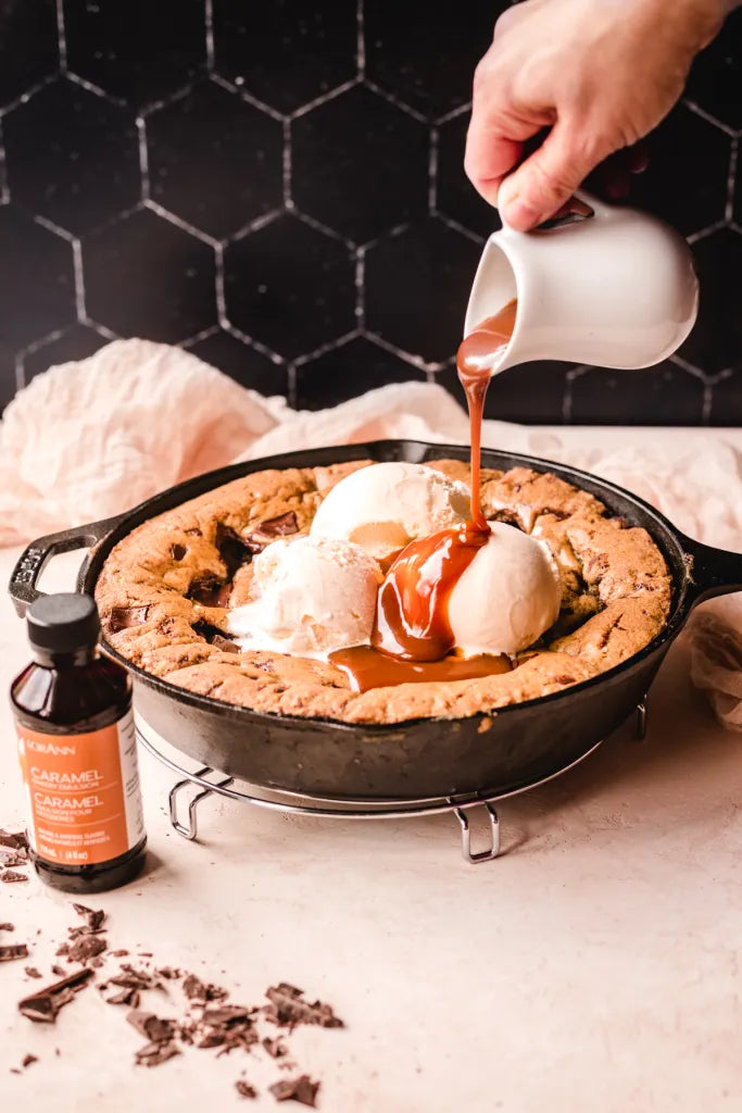 This cookie has layers upon layers of rich caramel flavor with crisp edges and a super gooey center. It’s simply perfect for eating straight out of the pan with a few scoops of creamy ice cream, an extra drizzle of salted caramel sauce, and a couple of spoons (if you’re sharing, that is!).