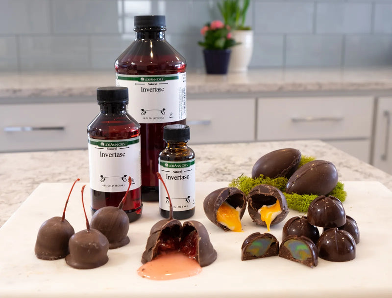 If you’ve ever wondered how chocolatiers get those fluid centers into a chocolate shell, the answer isn’t a tiny syringe or magic, it’s invertase. Invertase is a naturally occurring enzyme extracted from yeast. LorAnn’s invertase comes in liquid form, making it extra easy to add to confectionery fondant. After enrobing the fondant in chocolate, the invertase begins to break down the sugars, softening the fondant, yielding a creamy, sometimes liquid filling. This process can take anywhere from 3-10 days, so plan ahead and try not to eat your treats while you wait!